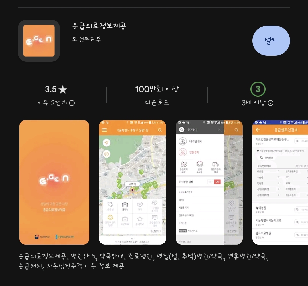 응급의료정보제공(e-gen)앱을 설치 하면 됩니다. 지금 추석 연휴 기간 뿐만 아니라 평상시에도 병의원의 많은 정보를 확인할 수 있는 편리한 앱입니다.