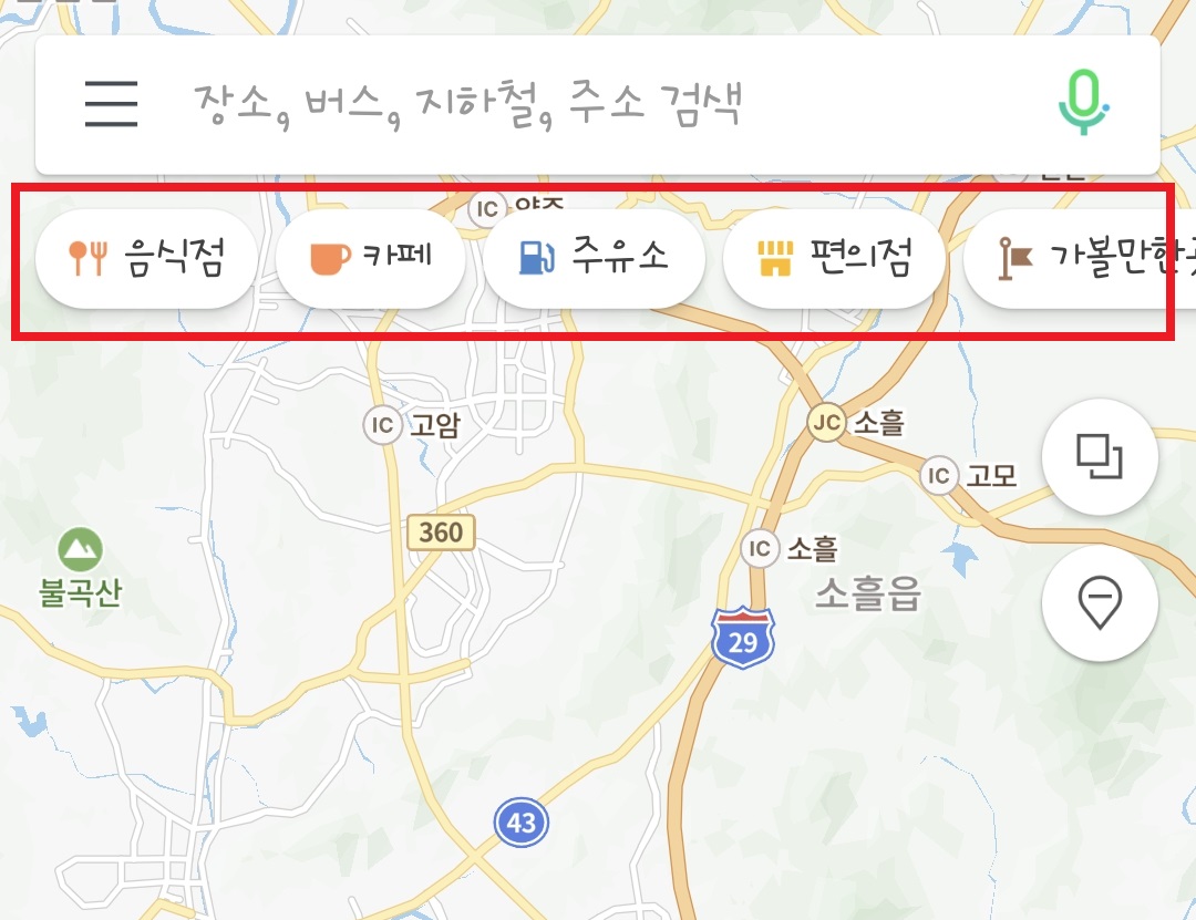 화면에 빨간 사각박스 안에 위와 같이 음식점, 카페, 주유소, 편의점 등 이렇게 나온다면 네이버지도 앱이 최신버전이 아닙니다. 아래 화면과 같이 최신버전으로 업데이트를 해주시기 바랍니다.