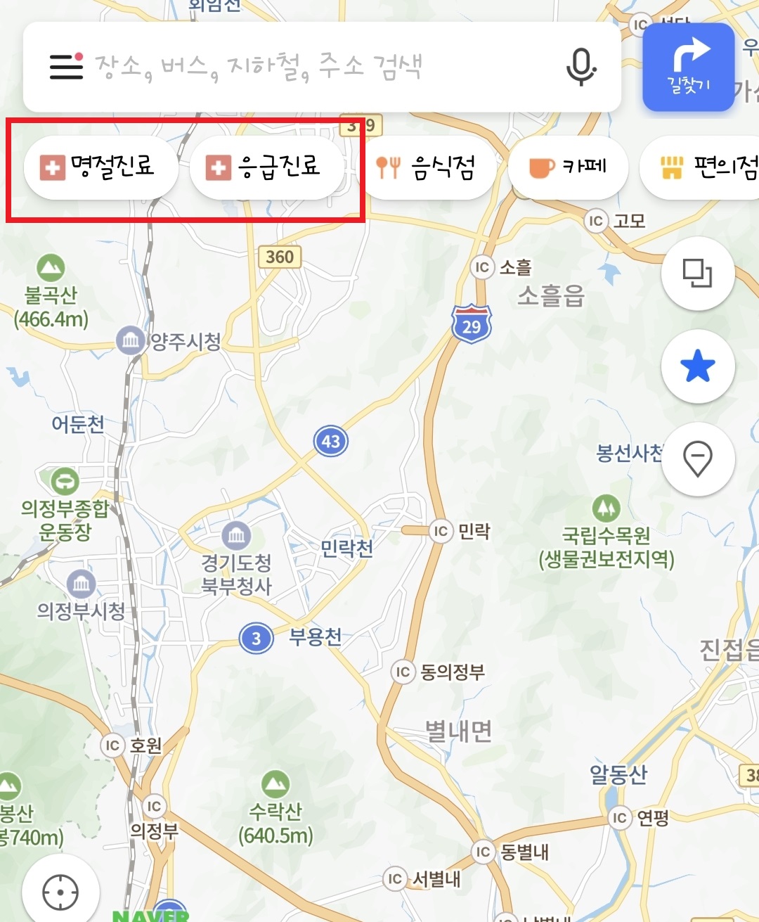 추석연휴에 급하기 병원을 찾아야 하는 일이 생긴다면 일단 네이버지도 앱을 켜고 상단에 있는 "명절진료" ,"응급진료" 탭을 클릭하여 자신의 주변에 있는 현재 문을 연 병원이나 응급실을 찾을 수 있습니다.