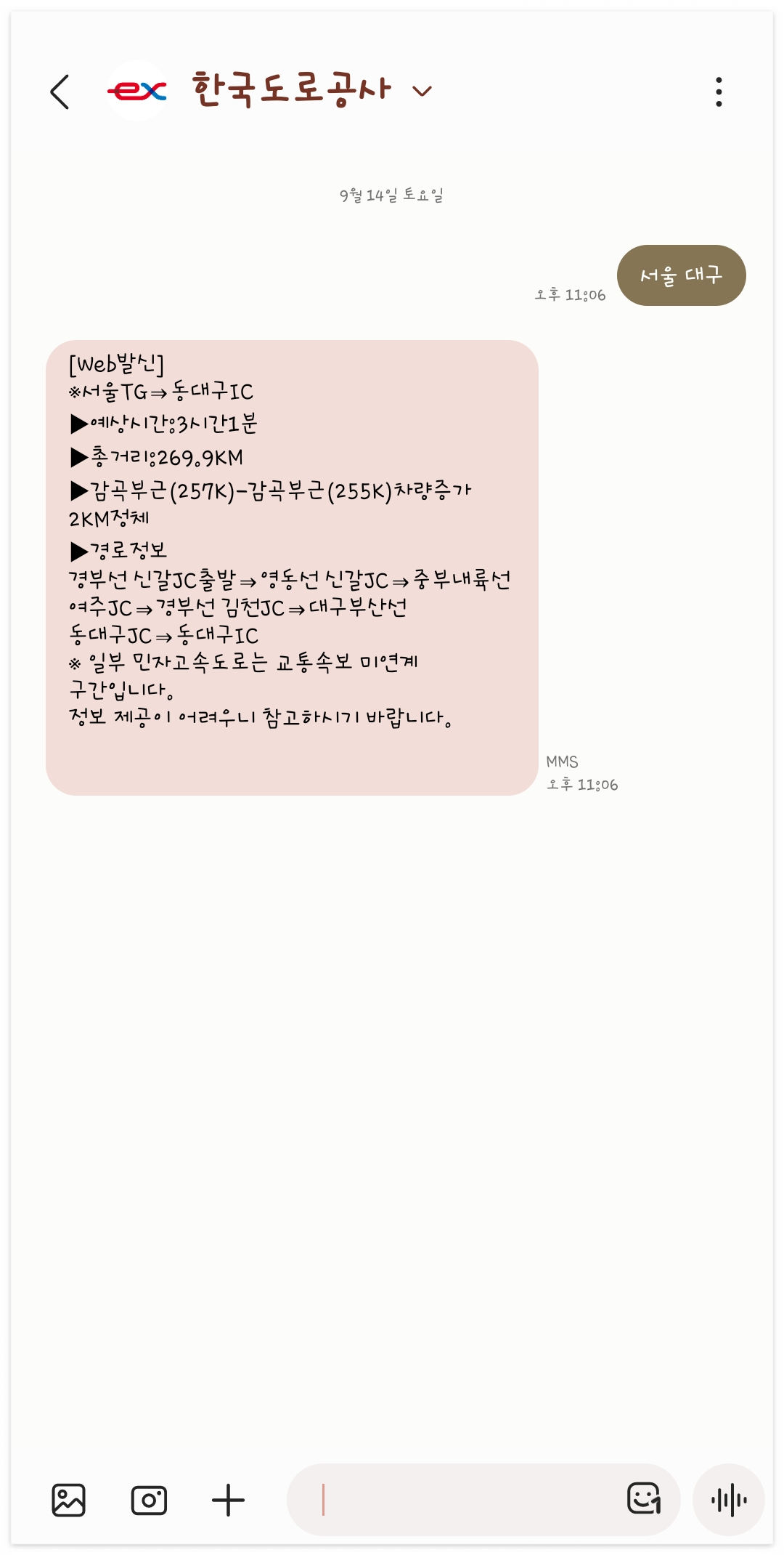 서울에서 대구까지 가는데에 걸리는 예상시간과 가는 경로, 정체구간 등을 빠르게 문자메세지로 답변을 받을 수 있습니다.